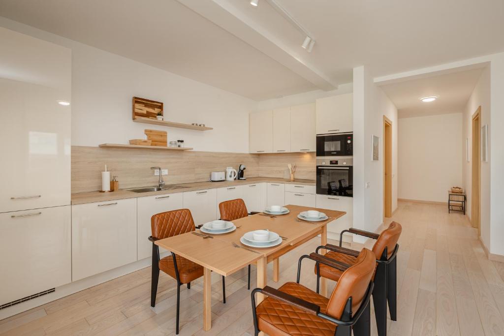 Refrigerator, Microwave, Dishwasher, Kitchen, Electric kettle, Oven, Stovetop, Toaster, Coffee machine, Dining table, Wine glasses